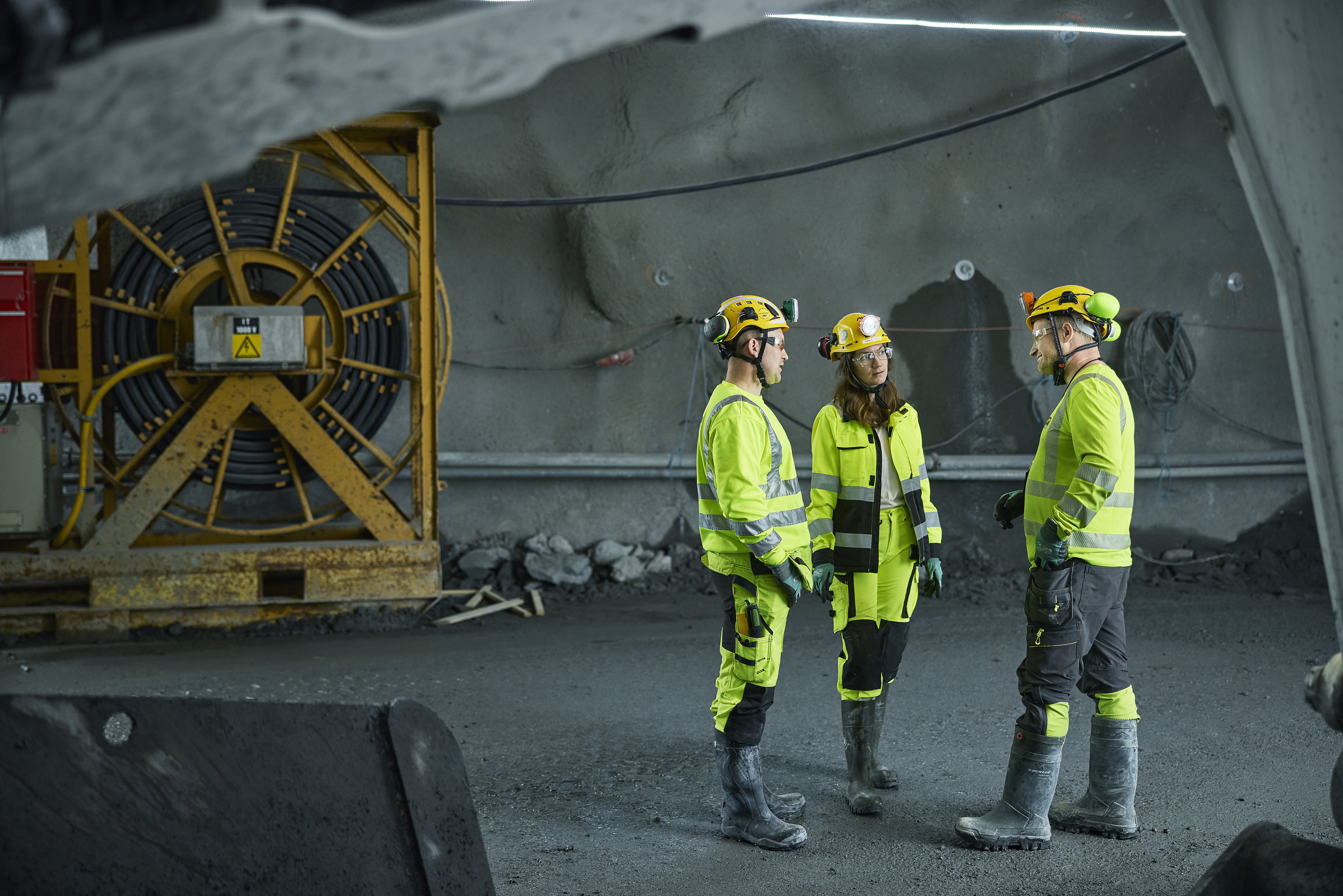 Prosjektleder Erling Kleiven, HMS/KS-leder Kari Bjørnebøle Hass og anleggsleder Arnt Helge Åbø i kabeltunnelen.